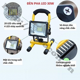 - Đèn pha Led siêu sáng IP65-30W là loại đèn xách tay chống nước có ánh sáng trắng chiếu sáng trang trí ngoài trời phù hợp, cấu tạo vỏ đèn chắc chắn với cấp độ bảo về IP65 chống xâm thực của bụi và nước, hơi ẩm. Đèn có góc tỏa lớn, chip LED 24 mắt chiếu cường độ chiếu sáng cao.