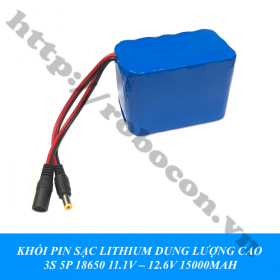 Khối Pin Sạc Lithium 3S 5P 18650 11.1V-12.6V 15000mah dung lượng cao hay ắc quy lithium, ắc quy mini, được sản xuất từ pin 18650 đóng thành pack 15 cell pin 3S 5p 12V 15AH dòng xả max 25A đã bao gồm mạch sạc và bảo vệ pin để bảo vệ pin trong quá trình sạc xả, với kích thước nhỏ gọn dễ sử dụng và mang theo sử dụng như 1 nguồn điện di động.