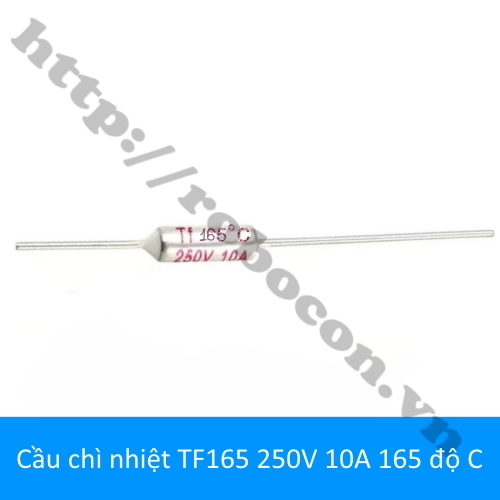 Cầu chì nhiệt TF165 250V 10A 165 độ C Cầu chì nhiệt là một thiết bị bảo vệ được lắp trong các thiết bị công suất và sinh nhiệt lớn như: máy khoan, máy xay sinh tố, bàn là, bếp từ, tủ lạnh, máy sấy tóc, lò vi sóng, lò nướng, nồi cơm điện … Có tác dụng bảo vệ thiết bị khi bị ngắn mạch, chập cháy, quá tải, hoặc một số linh kiện bị hỏng gây đoản mạch. Tránh hỏng thiết bị, quá tải nhiệt, phòng tránh cháy nổ.