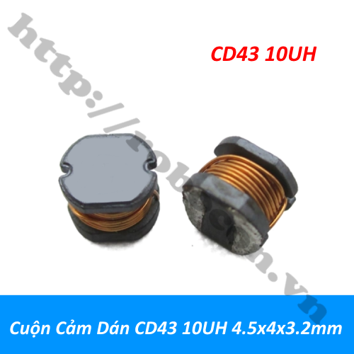 - Cuộn cảm dán CD43 10UH 4.5x4x3.2mm là ống dây thường sử dụng dây dẫn để cuốn thành cuộn cảm được chế tạo đặc biệt và bảo vệ bên ngoài bằng một ống co sẽ tạo thành cuộn cảm ống dây