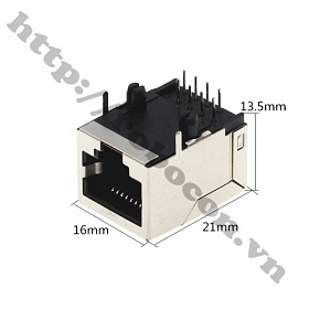 - Cổng mạng RJ-45 Socket có vỏ bọc kim loại bảo vệ, thân dài 21mm, 8 chân cắm kết nối hàn trên mạch được bố trí ở đuôi, 2 hàng so le nhau. Có thêm 2 tai kim loại và 2 chân nhựa 2 bên gắn cố định với bo mạch.