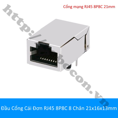 - Đầu cái đơn RJ45 8P8C 8 chân 21x16x13mm hay còn gọi là socket mạng, ổ cắm mạng với chân hàn 90 độ để hàn nối với các thiết bị kết nối mạng (cổng RJ45)
