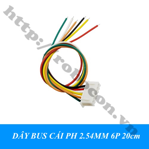 - Dây bus PH2.54mm 6P hay còn gọi là dây connector, dây cắm mạch dùng kết nối header trên mạch. Dây bus 2.54mm thường được sử dụng trong các mạch điện tử cắm bộ test, 1 sợi dây kết nối có 1 đầu cái (đầu đơn).