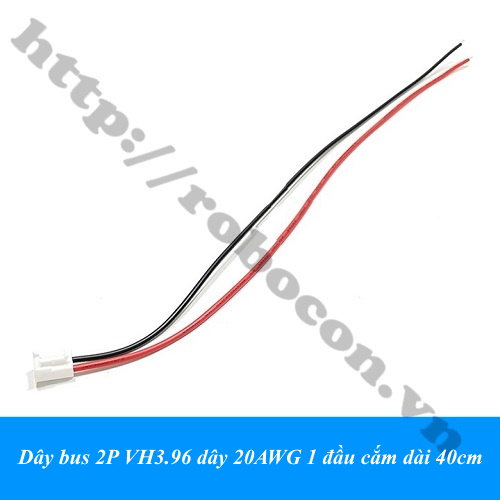 - Dây bus 2P VH3.96 dây 20AWG 1 đầu cắm dài 40cm là dây connector, dây cắm mạch dùng kết nối header trên mạch. Dây bus VH3.96 thường được sử dụng trong các mạch điện tử cắm bộ test, 1 sợi dây kết nối có 1 đầu cái (đầu đơn).