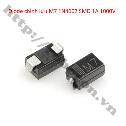 - DO60 diode chỉnh lưu M7 1N4007 SMD 1A 1000V là một diode silic chỉnh lưu phổ biến 1A thường được sử dụng trong các adapter AC cho các thiết bị gia dụng thông thường. Diode 1N4007 chịu được điện áp tối đa lên đến 1000V. Dòng điện cực đại qua mỗi diode 1N4007 là 1A, nếu dòng cao hơn sẽ gây nóng và cháy diode.