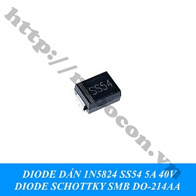 - Diode dán SS54 5A 40V diode schottky 1N5824 SMB DO-214AA hay diode chỉnh lưu là một linh kiện bán dẫn chỉ cho phép dòng điện đi qua theo một hướng. Dùng để chỉnh lưu điện áp AC thành điện áp DC trong các bộ nguồn xung, nguồn led, nguồn tổ ong, nguồn công suất, mạch điện tử.