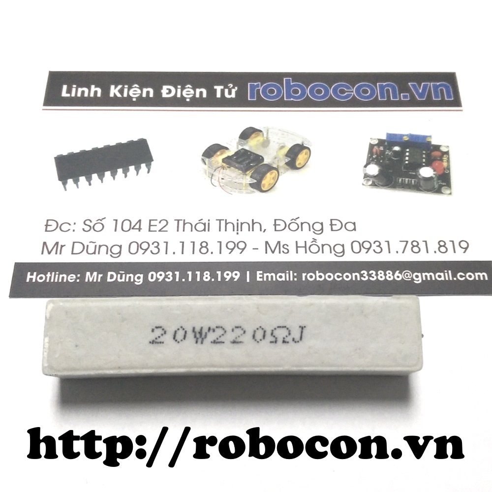 Điện trở sứ 220 Ohm 20W có công suất lớn, kích thước lớn hơn điện trở thường nên giá trị điện trở được ghi trực tiếp trên thân của điện trở.