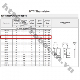 - Điện trở nhiệt NTC 5D-11 là một nghịch nhiệt trở, trở kháng của điện trở giảm khi nhiệt độ tăng., có thể hoạt động trong môi trường nhiệt độ cao và độ ẩm, cảm ứng nhiệt nhanh, độ nhạy cao, vững chắc, thuận tiện cho việc lắp ráp tự động.