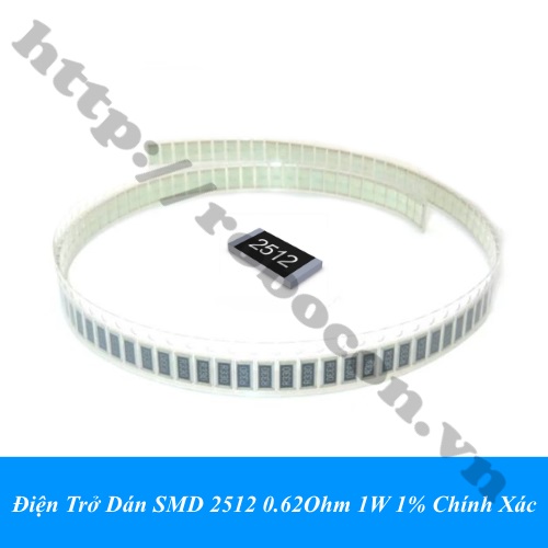 - Điện trở dán SMD 2512 – 0.62 ohm 1w 1% chính xác thuộc nhóm linh kiện điện tử thụ động đặc trưng cho sự cản trở dòng điện. Điện trở dán 2512 – 0.62 ohm là loại điện trở có giá trị cố định có dung sai rất nhỏ 1%, và chất lượng cao (nhiễu nhiệt nhỏ, đặc tính tần cao).