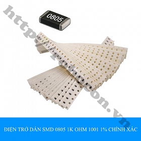 - Điện trở dán 0805 1K Ohm 1001 1% SMD chính xác (paste resister) thuộc nhóm linh kiện điện tử thụ động đặc trưng cho sự cản trở dòng điện, điện trở cầu chì. Điện trở dán 0805 1K Ohm là loại điện trở có giá trị cố định có dung sai rất nhỏ 1%, và chất lượng cao (nhiễu nhiệt nhỏ, đặc tính tần cao).