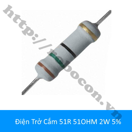 - Điện trở 51R 51Ohm 2W 5% được sản xuất theo công nghệ Metal film với sai số thấp chỉ 5%. Điện trở vạch 51ohm 2w có cấu tạo màng kim loại phù hợp với các mạch điện tử cần độ chính xác, hoạt động ổn định, bền với thời gian. Trên thân của điện trở chính xác 51ohm 2W có những vạch màu thể hiện giá trị của điện trở theo quy chuẩn thế giới để người dùng có thế dễ dàng lựa chọn điện trở phù hợp.