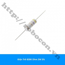 - Điện trở 820K Ohm 2W thuộc nhóm linh kiện điện tử thụ động đặc trưng cho sự cản trở dòng điện. Điện trở cắm 4 vạch màu 820K Ohm là loại điện trở có giá trị cố định có dung sai nhỏ 5%, và chất lượng cao (nhiễu nhiệt nhỏ, đặc tính tần cao).