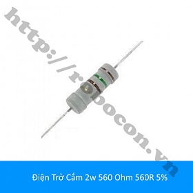 - Điện trở 2W 560R 560Ohm 5% được sản xuất theo công nghệ Metal film với sai số thấp chỉ 5%. Điện trở vạch 560ohm 2w có cấu tạo màng kim loại phù hợp với các mạch điện tử cần độ chính xác, hoạt động ổn định, bền với thời gian. Trên thân của điện trở chính xác 560ohm 2W có những vạch màu thể hiện giá trị của điện trở theo quy chuẩn thế giới để người dùng có thế dễ dàng lựa chọn điện trở phù hợp.