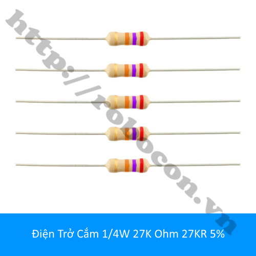 - Điện trở 1/4W 27KR 27K Ohm 5% được sản xuất theo công nghệ Cacbon film với sai số thấp chỉ 5%. Điện trở vạch 27kohm 1/4w có cấu tạo màng kim loại phù hợp với các mạch điện tử cần độ chính xác, hoạt động ổn định, bền với thời gian. Trên thân của điện trở chính xác 27KR 1/4W có những vạch màu thể hiện giá trị của điện trở theo quy chuẩn thế giới để người dùng có thế dễ dàng lựa chọn điện trở phù hợp.