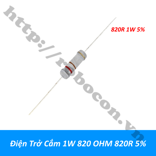 - Điện trở 1W 820 OHM 820R 5% được sản xuất theo công nghệ cacbon film với sai số thấp chỉ 5%. Điện trở phim 820R 1W có cấu tạo màng kim loại phù hợp với các mạch điện tử cần độ chính xác, hoạt động ổn định, bền với thời gian. Trên thân của điện trở chính xác 820 ohm 1W có những vạch màu thể hiện giá trị của điện trở theo quy chuẩn thế giới để người dùng có thế dễ dàng lựa chọn điện trở phù hợp.
