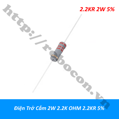 - Điện trở 2W 2.2KR 2.2K Ohm 5% được sản xuất theo công nghệ Cacbon film với sai số thấp chỉ 5%. Điện trở phim 2.2k OHM 2W có cấu tạo màng kim loại phù hợp với các mạch điện tử cần độ chính xác, hoạt động ổn định, bền với thời gian. Trên thân của điện trở chính xác 2.2KR 2W có những vạch màu thể hiện giá trị của điện trở theo quy chuẩn thế giới để người dùng có thế dễ dàng lựa chọn điện trở phù hợp.