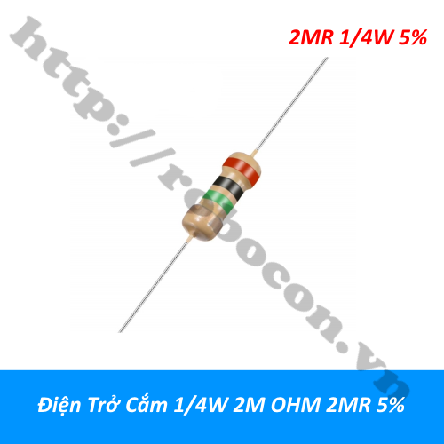- Điện trở cắm 1/4W 2M OHM 2MR 5% được sản xuất theo công nghệ Cacbon film với sai số thấp chỉ 5%. Điện trở phim 1/4W 2M OHM có cấu tạo màng kim loại phù hợp với các mạch điện tử cần độ chính xác, hoạt động ổn định, bền với thời gian. Trên thân của điện trở chính xác 1/4W 2M OHM có những vạch màu thể hiện giá trị của điện trở theo quy chuẩn thế giới để người dùng có thế dễ dàng lựa chọn điện trở phù hợp.