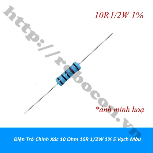 - Điện trở chính xác 10 Ohm 10R 1/2W 1% 5 vạch màu thuộc nhóm linh kiện điện tử thụ động đặc trưng cho sự cản trở dòng điện. Điện trở cắm 5 vạch màu 10 Ohm là loại điện trở có giá trị cố định có dung sai nhỏ 1%, và chất lượng cao (nhiễu nhiệt nhỏ, đặc tính tần cao).