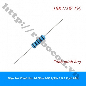 - Điện trở chính xác 10 Ohm 10R 1/2W 1% 5 vạch màu thuộc nhóm linh kiện điện tử thụ động đặc trưng cho sự cản trở dòng điện. Điện trở cắm 5 vạch màu 10 Ohm là loại điện trở có giá trị cố định có dung sai nhỏ 1%, và chất lượng cao (nhiễu nhiệt nhỏ, đặc tính tần cao).