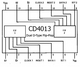 IC CD4013BE là một loại D flip-flops được cấu tạo bên trong là 2 flip-flops loại D với hai trạng thái ổn định. Sử dụng đầu vào kích để thay đổi trạng thái 0 và 1. Mỗi flip-flop có dữ liệu độc lập, set, reset, và các đầu vào clock. Thiết lập hoặc cài đặt lại là độc lập của xung clock và được thực hiện bởi một cấp độ cao trên các thiết lập hoặc thiết lập đường dây tương ứng.