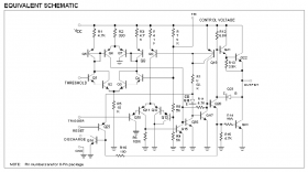 Cấu trúc bên trong của NE555 nó tương đương với hơn 20 transitor, 15 điện trở và 2 diode và còn phụ thuộc vào nhà sản xuất. Trong mạch tương đương có: đầu vào kích thích, khối so sánh, khối điều khiển chức năng hay công suất đầu ra. Một số đặc tính nữa của 555 là: Điện áp cung cấp nằm giữa trong khoảng từ 4V đến 16V, dòng cung cấp từ 3 đến 6 mA.