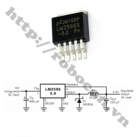 - IC nguồn LM2596S-5.0 buck 3A TO263-5 là một IC ổn áp dạng xung DC-DC với điện áp vào lớn nhất là 40V và thấp nhất là 4.5V. Dòng điện đầu ra đạt 3A hiệu xuất cao nhờ ứng dụng cơ chế băm xung ở tần số lên tới 150KHz. Trong quá trình hoạt động LM2596S luôn được đặt trong các chế độ bảo vệ quá nhiệt và quá dòng.