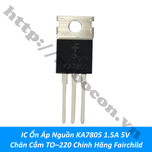 - IC nguồn KA7805 chính hãng Fairchild có thế cung cấp điện áp đầu ra với dòng điện lên đến 1.5A. IC nguồn này được sử dụng rất rộng rãi trong các thiết bị điện tử, các nguồn, module mạch.