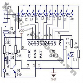 MDL295 Mạch led nháy theo nhạc CD4017 sử dụng để chế tạo led nhấp nháy theo âm thanh. Với 11 đèn LED phát ra ánh sáng với mức độ âm thanh tuần hoàn cao và thấp. Âm thanh to hơn, tốc độ dòng nháy LED càng nhanh. Đèn LED nhấp nháy mỗi chu kỳ, hiển thị một cách trực quan.