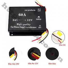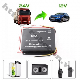 - Bộ đổi nguồn 24v xuống 12v 60A là bộ inverter hạ áp, chuyển đổi dòng điện 1 chiều 24v DC xuống dòng điện DC 1 chiều 12v DC công suất lên đến 720W chuyên dụng dành riêng cho ô tô, xe tải, xe khách, xe container sử dụng cho camera hành trình, tủ lạnh xe hơi, máy ảnh, loa siêu trầm DVD VCD CD, loa hiển thị bộ đàm, phù hợp với tất cả các loại thiết bị cần nguồn điện 12V.