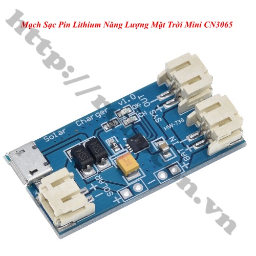 - Mạch sạc pin lithium năng lượng mặt trời mini 6V CN3065 là bộ sạc Lipo năng lượng mặt trời siêu nhỏ dựa trên chip quản lý sạc pin lithium duy nhất CN3065.