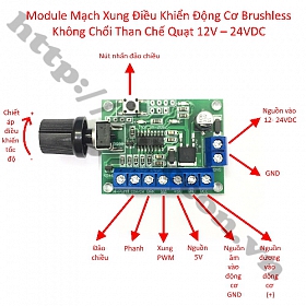 - Module mạch xung điều khiển cho động cơ brushless không chổi than chế quạt 12v – 24vdc là bo mạch chuyên dùng để điều khiển, điều tốc động cơ không chổi than hay được gọi là brushless. Bộ điều khiển được sử dụng để điều khiển cho động cơ 12w, 15w, 21w, 21.6w, 21.8w, 46w, 48w, động cơ quạt chạy điện ắc quy 12v, 24v…