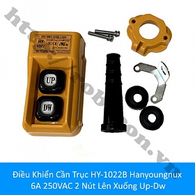 - Điều khiển cần trục HY-1022B Hanyoung gồm 2 công tắc nhấn lên - xuống, không có nút dừng khẩn. Thiết bị HY-1022B Hanyoung hoạt động với dòng hiện hành 6A 250V AC