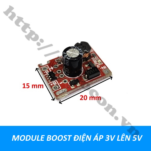 Mạch boost điện áp DC-DC 3V lên 5V có kích thước dài 15mm x Rộng 20mm, chuẩn đầu ra usb. Mạch boost điện áp DC-DC 3V lên 5V có thể boost được điện áp từ 3V lên chuẩn đầu ra ổn định - (GND); + (+5V).
