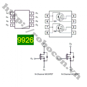 - MO23 Mosfet 9926 sop – 8 20V 6.5A kênh N SMD hay mosfet 8 chân dán, mosfet kép, dual kênh, mosfet NPN là mosfet kênh N hay mosfet ngược loại chân dán.