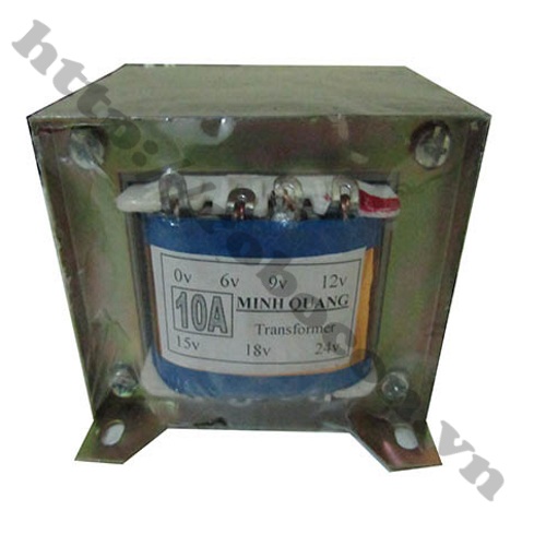 Biến áp 10A là thiết bị để biến đổi điện áp xoay chiều, cấu tạo bao gồm một cuộn sơ cấp (đưa điện áp vào) và một hay nhiều cuộn thứ cấp (lấy điện áp ra sử dụng) cùng quấn trên một lõi từ có thể là lá thép hoặc lõi feri. Cung cấp nhiều mức điện áp ra: 6V 9V 12V 15V 18V 24V