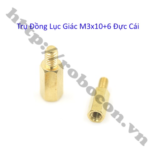 Trụ đồng lục giác M3x10+6 đực cái hay cọc đồng lục giác có ren M3x10+6 là loại cọc được làm bằng đồng với 2 đầu ren âm dương tổng chiều dài 16mm.