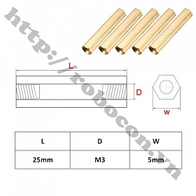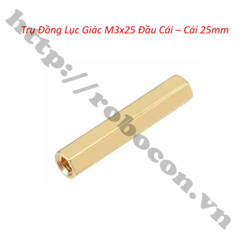 - Trụ đồng lục giác M3x25 hai đầu âm hay cọc đồng lục giác 2 đầu âm có ren M3x25 là loại cọc được làm bằng đồng với 2 đầu ren âm chiều dài 25mm.