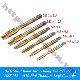 Bộ 6 mũi taro thẳng tạo ren M3 – M10 được làm từ thép gió 6542 phủ Titanium có độ cứng cao đến HRC 65, độ bền nhiệt tốt chuyên tạo ren trên tấm inox 304 và thép cứng, kim loại mềm. Do độ ổ định độ cứng mũi khoan với nhiệt khá cao nên sản phẩm này phù hợp trong sản xuất công nghiệp.