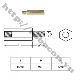 Trụ đồng lục giác M4x15+6 đực cái hay cọc đồng lục giác có ren M4x15 là loại cọc được làm bằng đồng với 2 đầu ren đực cái chiều dài 15mm, phần ren 6mm