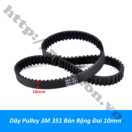 - Dây pulley 3M-351 bản rộng đai 10mm (còn được gọi timing belt) là loại dây curoa có cơ cấu truyền tải cho động cơ, làm máy mài, máy cắt mini. Bulley 351 còn có thể làm phụ kiện cho máy cưa tự chế, làm bộ truyền chuyển động. Với bước răng 3mm được dùng để kết hợp với pulley để truyền chuyển động, động cơ 777, động cơ 795