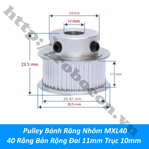 - Pulley bánh răng nhôm MXL40 40 răng bản rộng đai 11mm trục 10mm hay puli trục 10, buli trục 10 li, puly 40 răng chuẩn MXL sử dụng rộng rãi trong máy công cụ, dệt vải gia đình, in ấn, bao bì thực phẩm, dây và cáp điện, thiết bị đo đạc, hóa dầu, viễn thông và các ngành công nghiệp khác trong cơ cấu ổ đĩa vành đai.