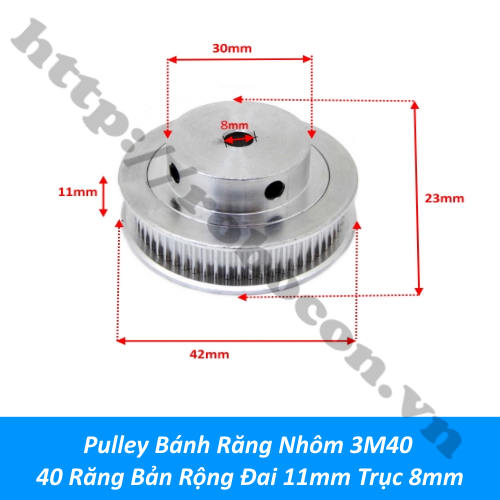 - Pulley bánh răng nhôm 3m40 bản rộng đai 11mm trục 8mm là cơ cấu truyền tải cho động cơ, làm máy mài, máy cắt mini. Làm phụ kiện cho máy cưa, máy khoan tự chế, làm bộ chuyền chuyển động cho động cơ 775, 795, máy CNC, máy in 3D, RC, máy nổ, máy bay điều khiển, tàu thủy…