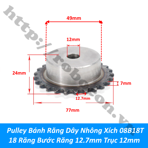 - Pulley bánh răng dây nhông xích 08B18T 18 răng bản dày 7mm trục 12mm còn được gọi sên nhông xích là cơ cấu truyền tải cho động cơ, làm máy mài, máy cắt mini. Làm phụ kiện cho máy cưa, máy khoan tự chế, làm bộ chuyền chuyển động cho động cơ 775, 795, máy CNC, máy in 3D, RC, máy nổ, xe máy, ô-tô, …