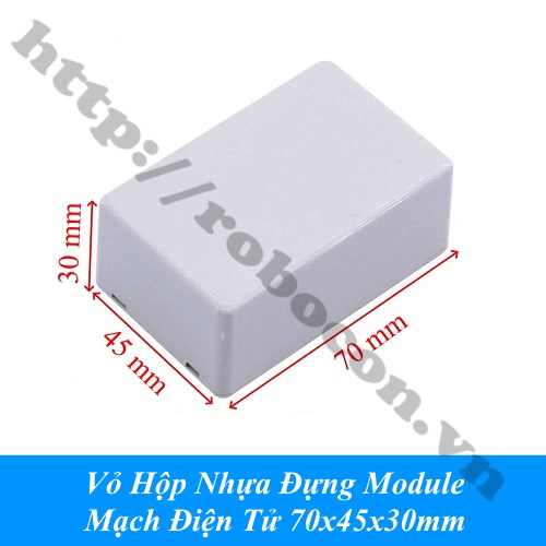 Vỏ hộp nhựa đựng module, mạch điện tử 70x45x30mm (plastic box) là sản phẩm dùng để bảo vệ mạch điện của bạn khỏi các tác nhân môi trường gây hỏng hóc, nhiễu linh kiện do môi trường xung quanh, giúp dự án của bạn có tính thẩm mĩ cao.