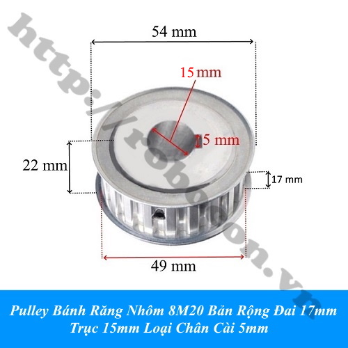 - Pulley Bánh Răng Nhôm 8M20 Bản Rộng Đai 17mm Trục 15mm Loại Chân Cài 5mm là cơ cấu truyền tải cho động cơ, làm máy mài, máy cắt mini. Làm phụ kiện cho máy cưa, máy khoan tự chế, làm bộ chuyền chuyển động cho động cơ 775, 795, máy CNC, máy in 3D, RC, máy nổ, máy bay điều khiển, tàu thủy…