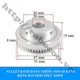 - Pulley 3M50 50 răng loại BF rộng đai 8mm trục 20mm là cơ cấu truyền tải cho động cơ, làm máy mài, máy cắt mini. Làm phụ kiện cho máy cưa, máy khoan tự chế, làm bộ chuyền chuyển động cho động cơ 775, 795