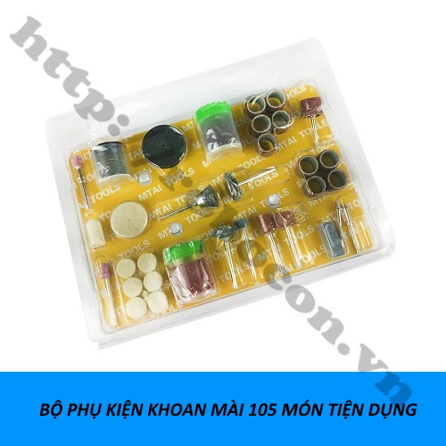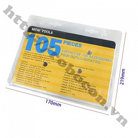 - Bộ sản phẩm gồm 105 đầu mũi khoan, cắt, mài trục 3,17 và lưỡi cưa, phay, chà, nhám, đá mài các loại.