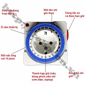 - Nút đỏ bên hông ổ cắm gạt xuống hình đồng hồ là sử dụng ổ cắm ở chế độ hẹn giờ. Nếu gạt lên chữ ON là sử dụng ổ cắm như một phích nối- tức là không hẹn giờ.