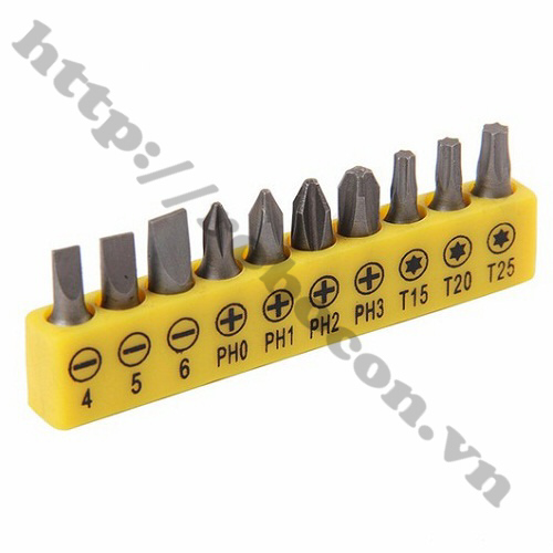 - Bộ sản phẩm gồm: 10 đầu vít với các dạng đầu dẹt, đầu 4 cạnh , đầu 6 cạnh
