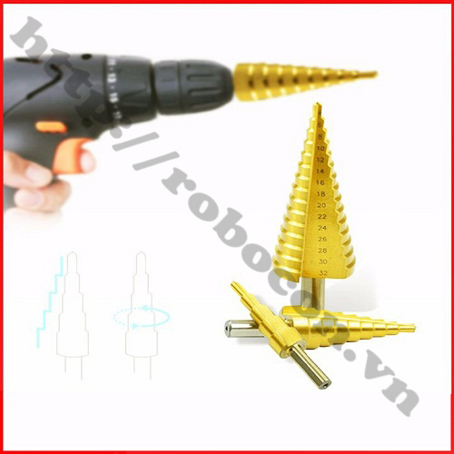 Bộ 3 mũi khoan bước dùng để tạo lỗ tròn đều trên các vật liệu mỏng hơn 6mm bằng cách khoan dần từ bước đường kính 4mm, khi khoan hết đường kính bé, bề mặt sẽ tiếp xúc với cạnh cắt của mũi khoan bước để chuyển lên bước với đường kính tiếp theo. Với một mũi khoan bước có thể thay thế cho rất nhiều mũi kích thước từ bé đến lớn, cụ thể, trong bộ mũi khoan bước này có 15 bước đường kính khác nhau từ 4mm đến 32mm.